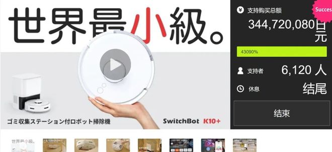 截至2023年6月•★,SwitchBot的扫地机器人K10+在Makuake平台上获得了6120名支持者…●○,众筹金额达3☆▼☆▷-=.44亿日元(折合人民币约1600万)•□◁◁,荣登日本扫地机品类众筹金额第一▼▲◁•◁☆。